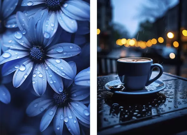 Poster Flori albastre cu picături de apă și o ceașcă de cafea în ploaie Nr d00694