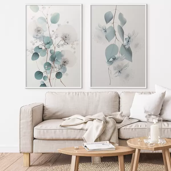 Poster Ramură de eucalipt cu frunze albastre și flori albe, fundal deschis d00829