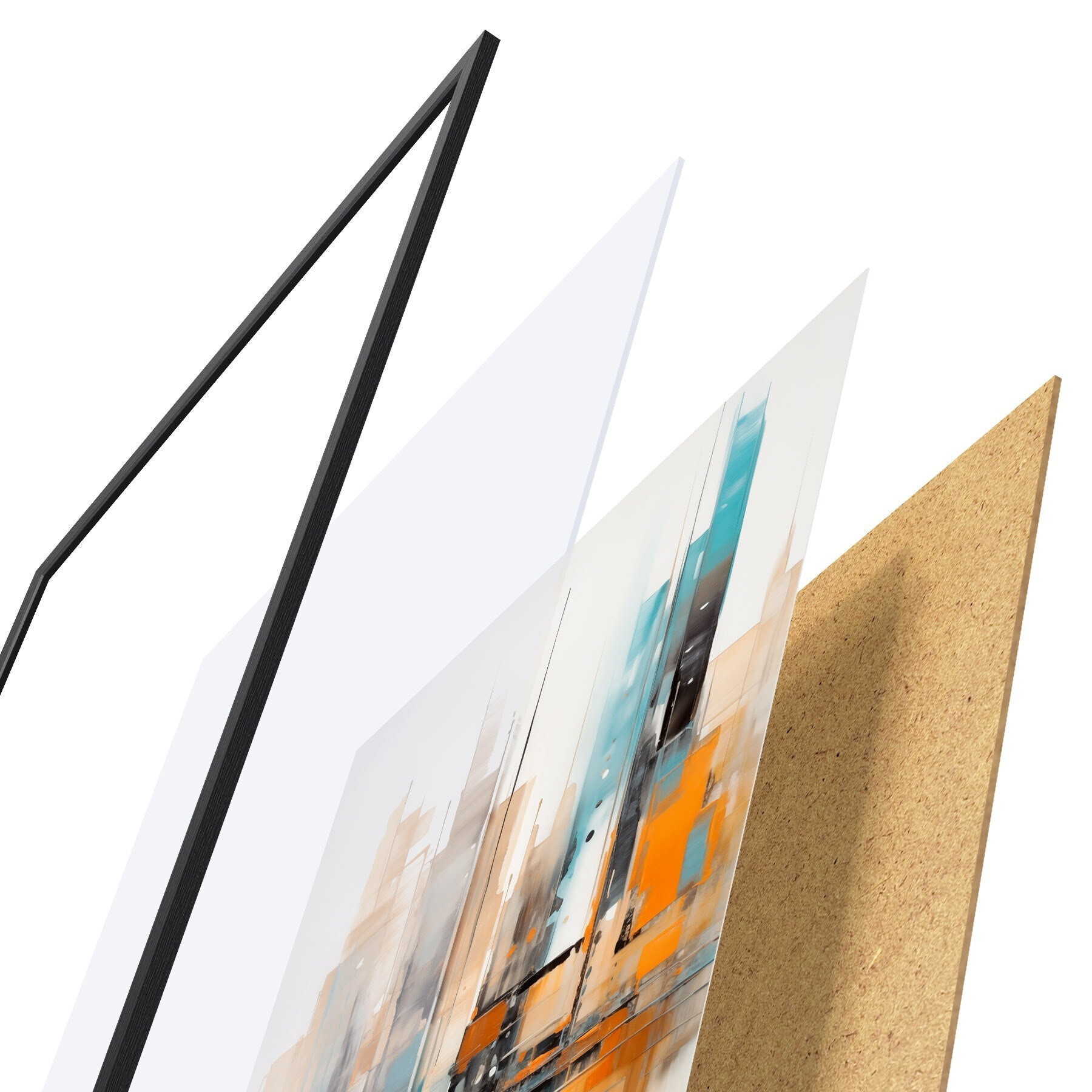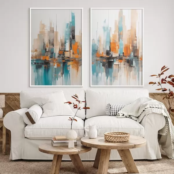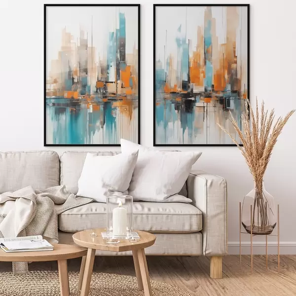 Poster Peisaj urban abstract cu tușe verticale în nuanțe de portocaliu, albastru și alb, stil pictural Nr d00876