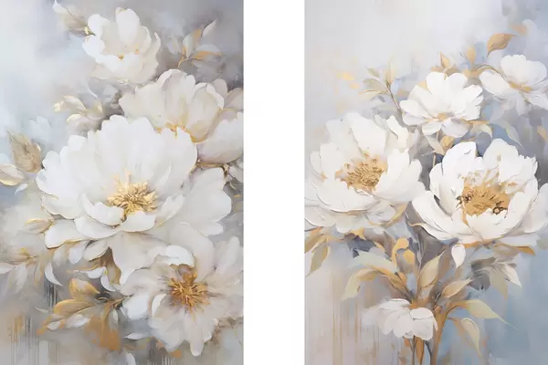 Poster Bujori albi cu mijlocul și frunzele galbene, tușe delicate, fundal albastru deschis, aranjament floral Nr d00878