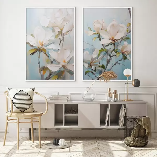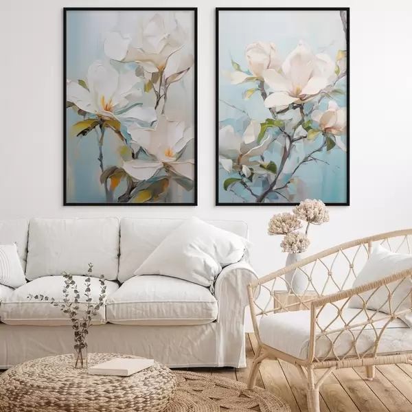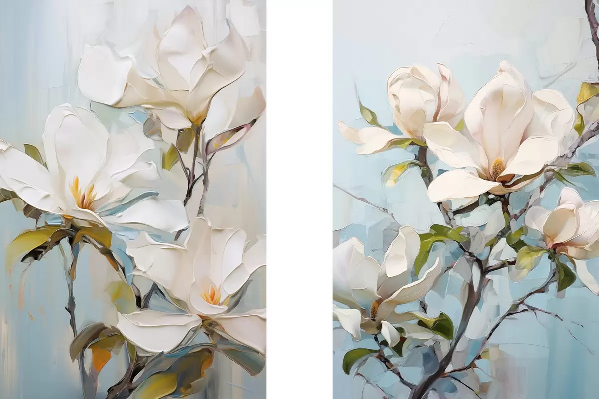 Poster Flori albe de magnolie, fundal albastru deschis cu tușe delicate, stil pictură în ulei, textură impasto Nr d00881