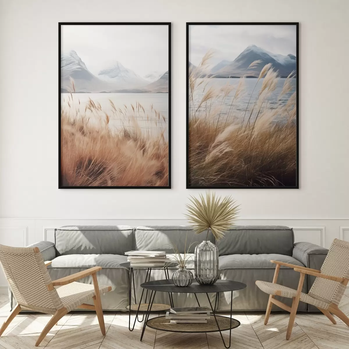 Poster Iarbă de pampas cu un lac și munți în fundal, iluminare difuză, culori discrete, stil naturalist Nr d00884