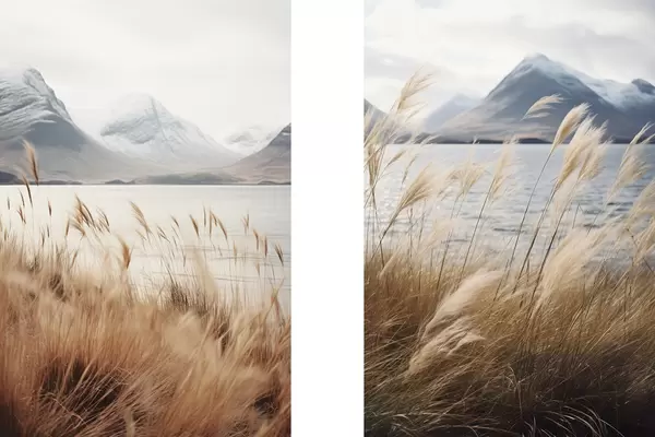 Poster Iarbă de pampas cu un lac și munți în fundal, iluminare difuză, culori discrete, stil naturalist Nr d00884