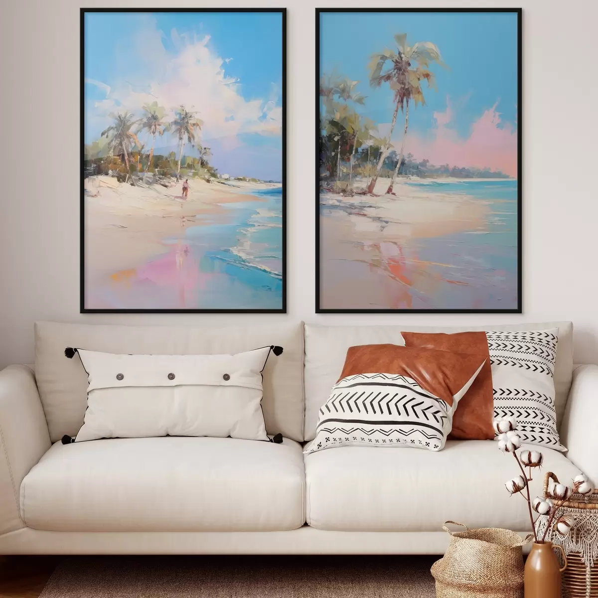 Poster Peisaj abstract, o plajă cu palmieri, o zi însorită cu cer albastru și câteva nori Nr d00885