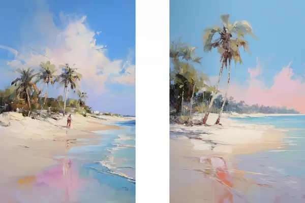 Poster Peisaj abstract, o plajă cu palmieri, o zi însorită cu cer albastru și câteva nori Nr d00885