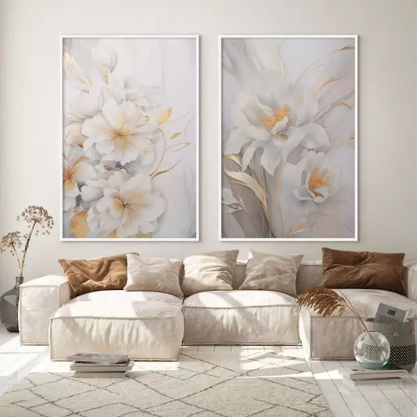Poster Flori albe cu detalii galbene, petale cu umbre subtile, fundal deschis cu efect marmorat subtil Nr d00889
