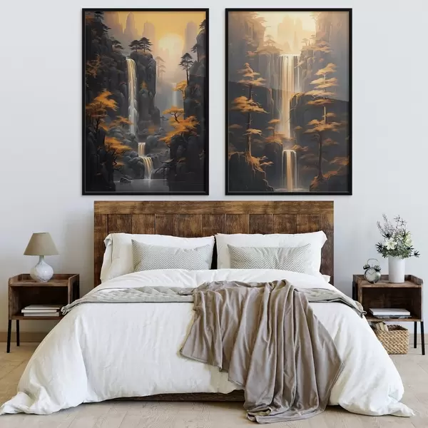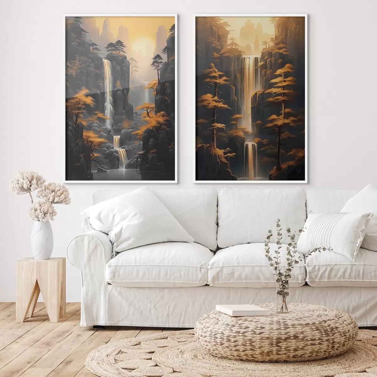 Poster Peisaj cu cascadă și munți în lumină aurie Nr d00928