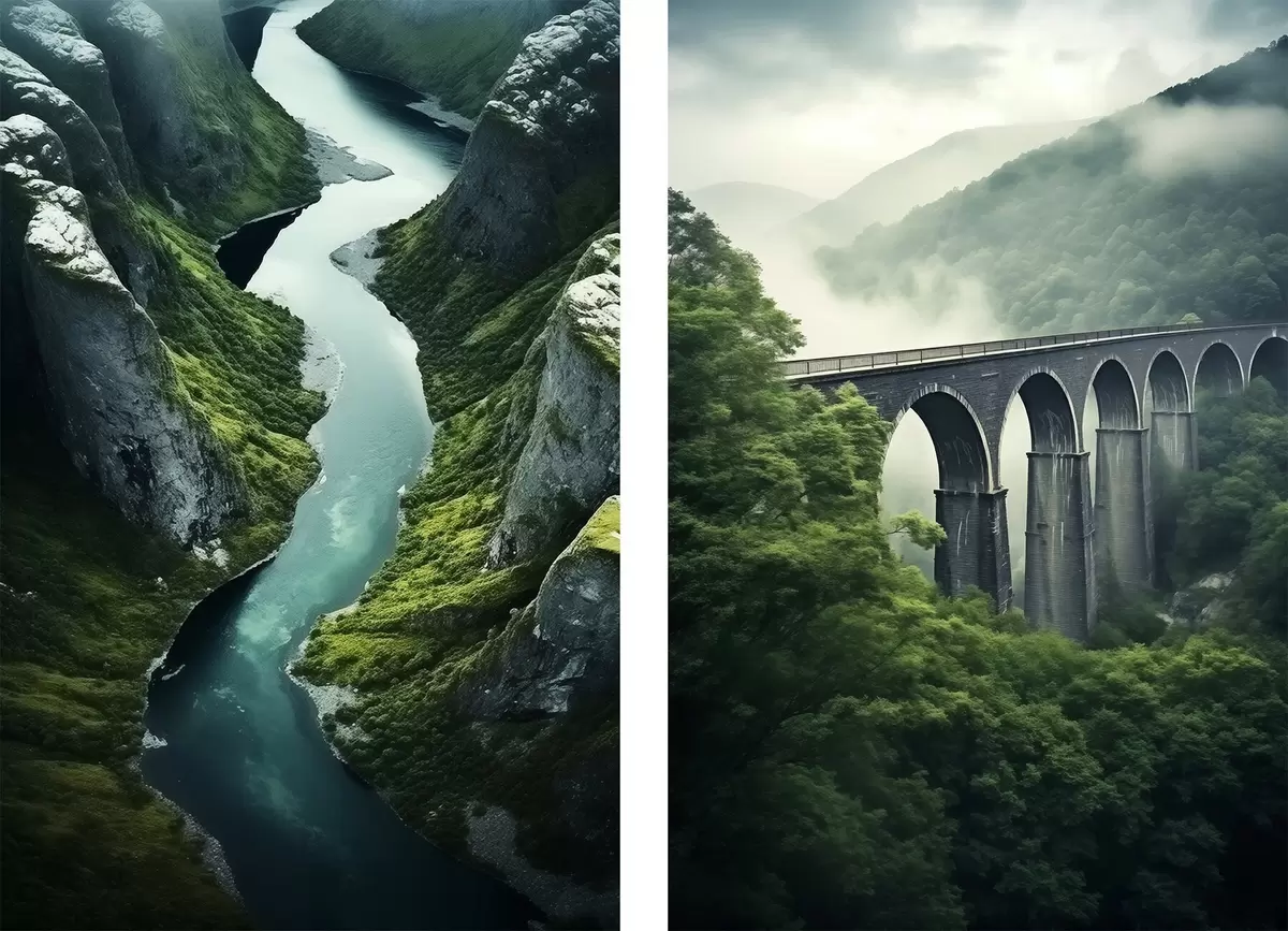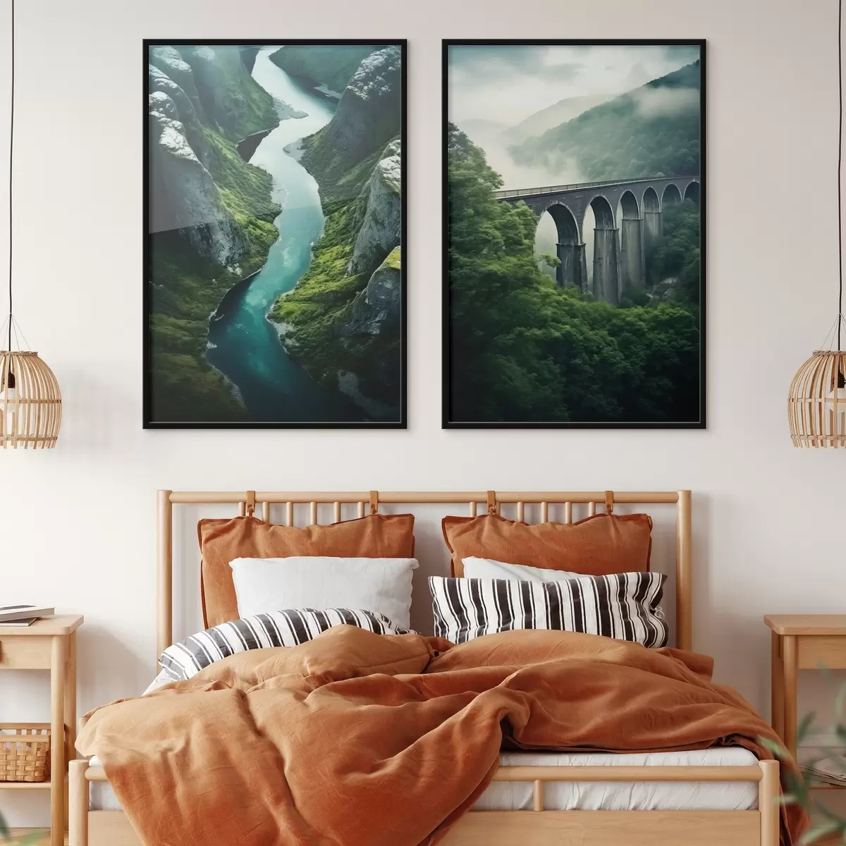 Poster Canionul râului aerian și viaductul învăluit în ceață, înconjurat de dealuri verzi Nr d00967