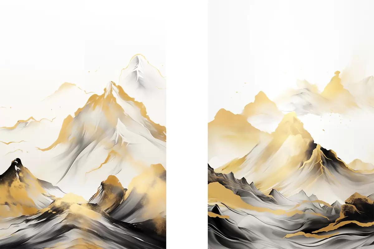 Poster Munți texturați galbeni și negri cu vârfuri înzăpezite, stil de pictură cu tuș, lanț muntos minimalist Nr d01002