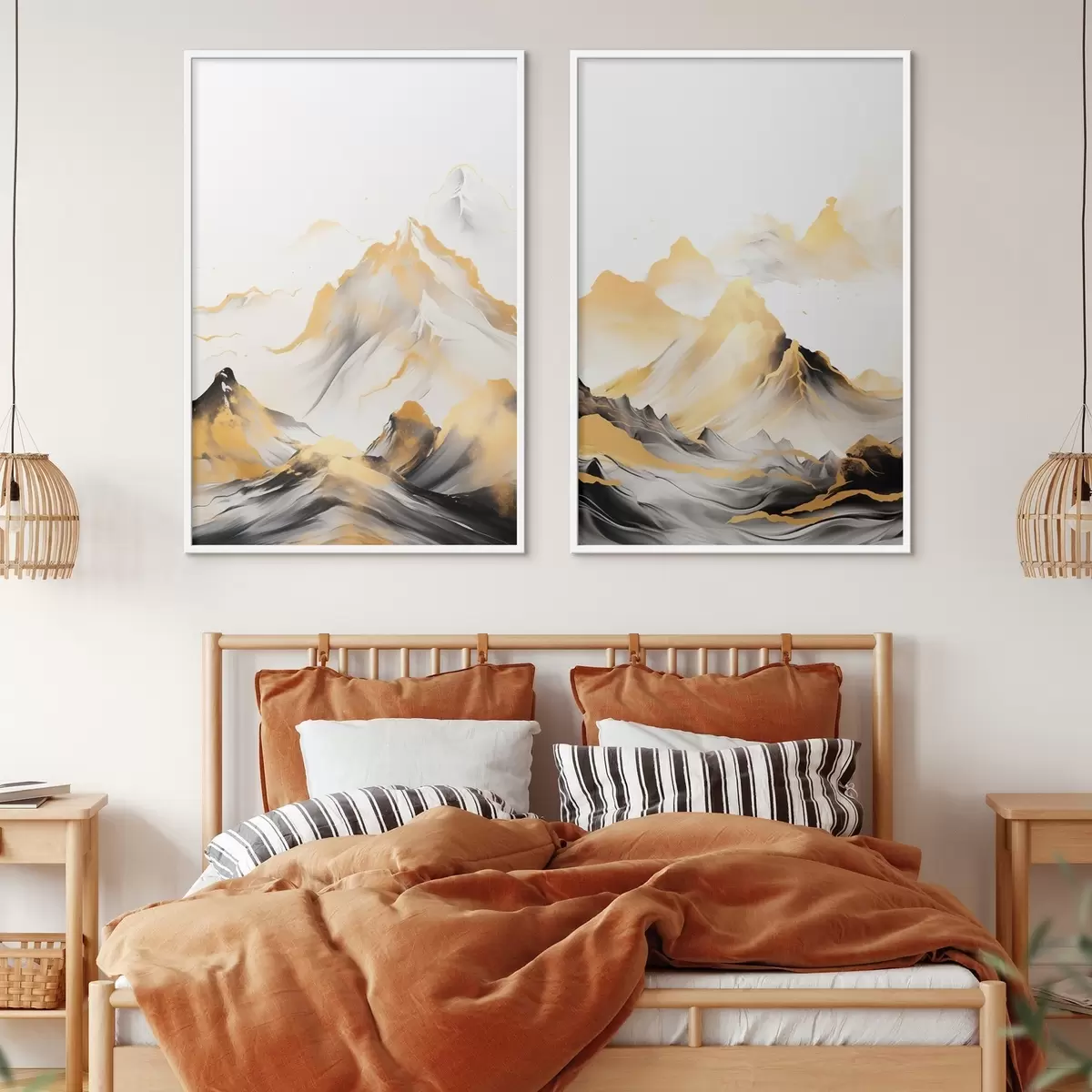 Poster Munți texturați galbeni și negri cu vârfuri înzăpezite, stil de pictură cu tuș, lanț muntos minimalist d01002