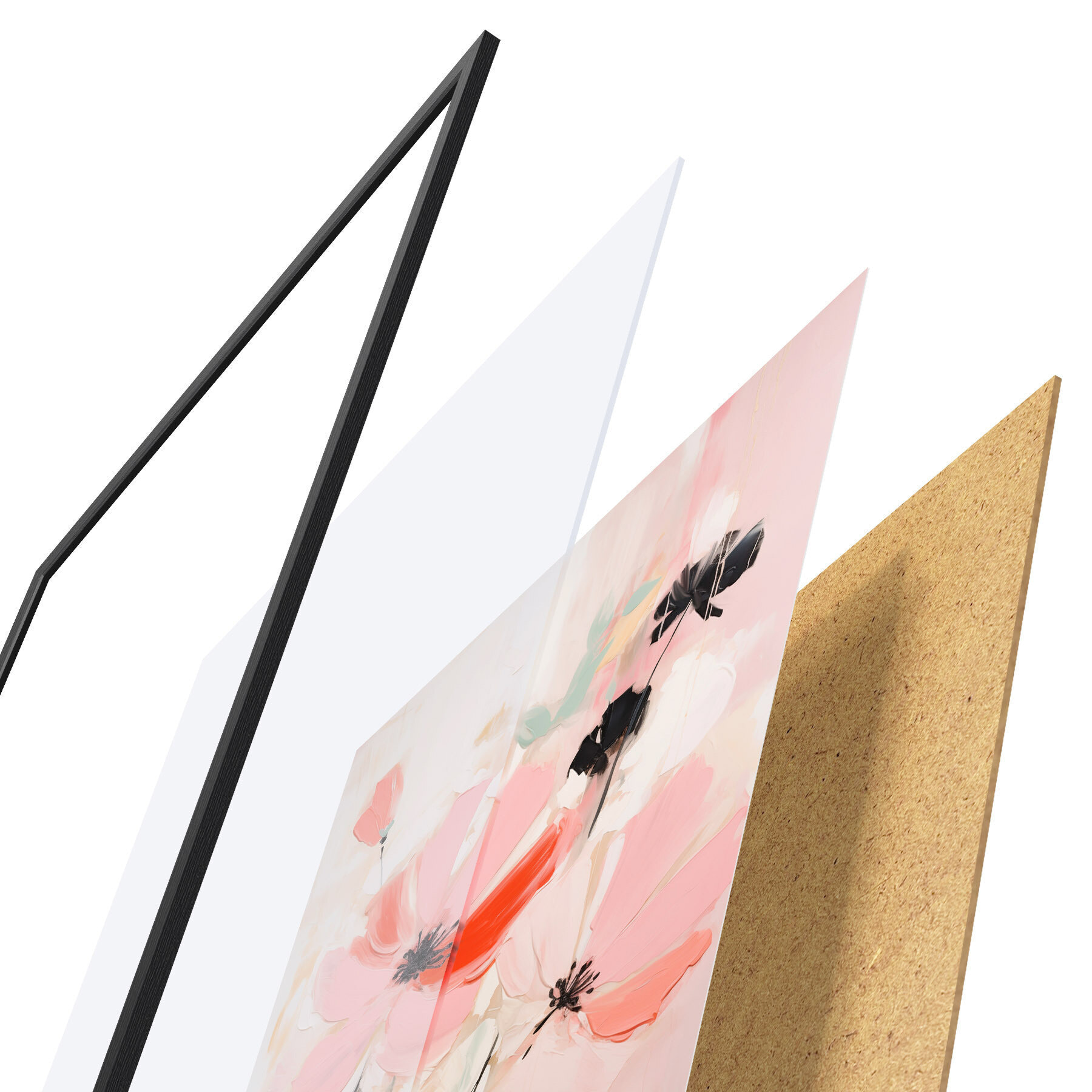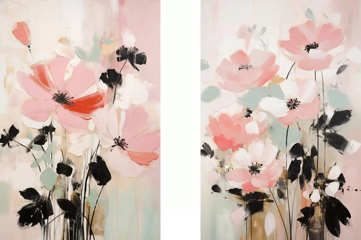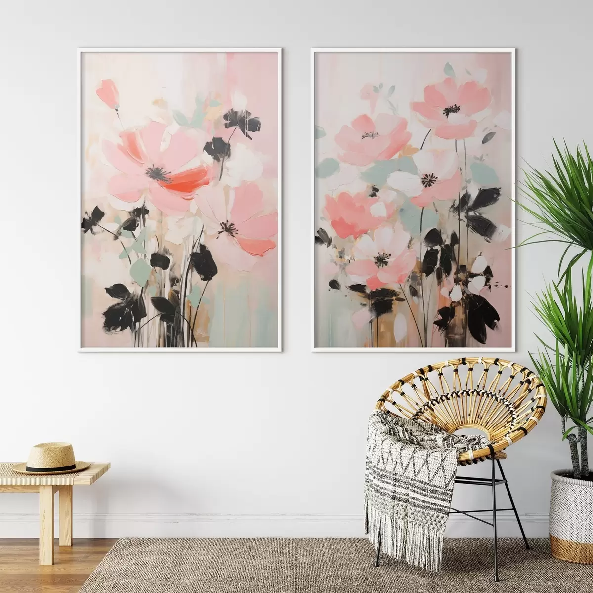 Poster Flori roz și negre cu frunze, culori pastelate delicate, aranjament floral abstract, artă minimalistă Nr d01004