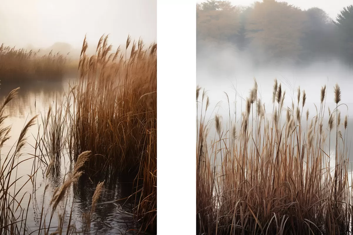 Poster Stuf înalt crescând într-un corp de apă, apa reflectă stuful, fundal cețos, lumină difuză, peisaj natural Nr d01008