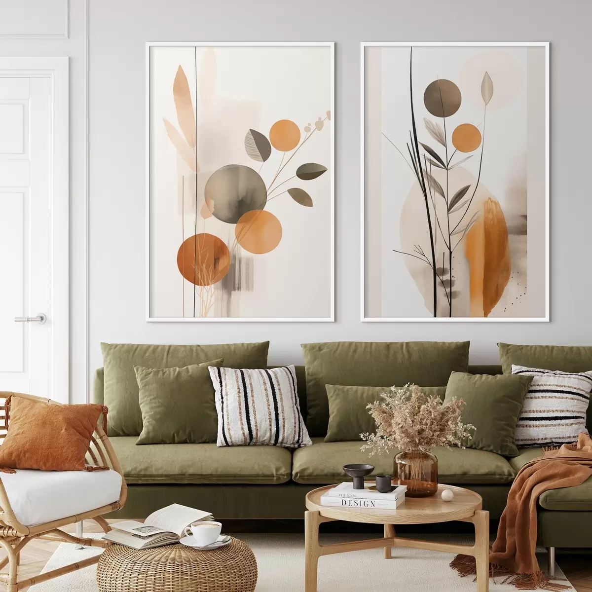 Poster Imitare de pictură abstractă cu cercuri portocalii și gri, frunze și ramuri, stil modern, efect de acuarelă d01009