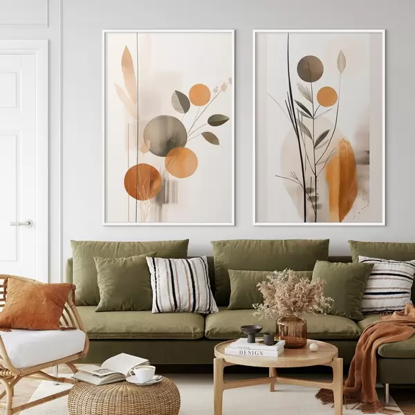 Poster Imitare de pictură abstractă cu cercuri portocalii și gri, frunze și ramuri, stil modern, efect de acuarelă Nr d01009
