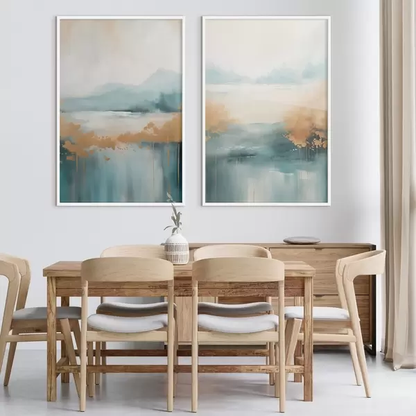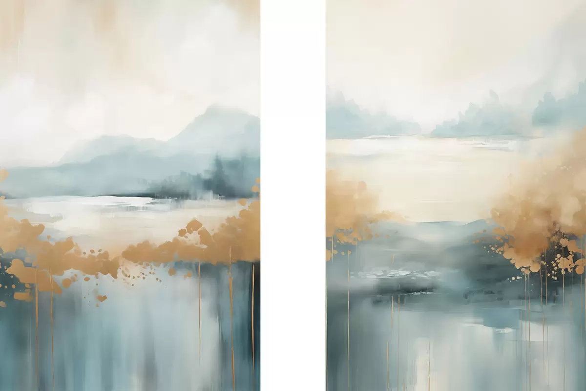 Poster Peisaj abstract cu munți și lac în nuanțe de verde-albastru și galben texturat, pensule moi, operă de artă minimalistă d01012