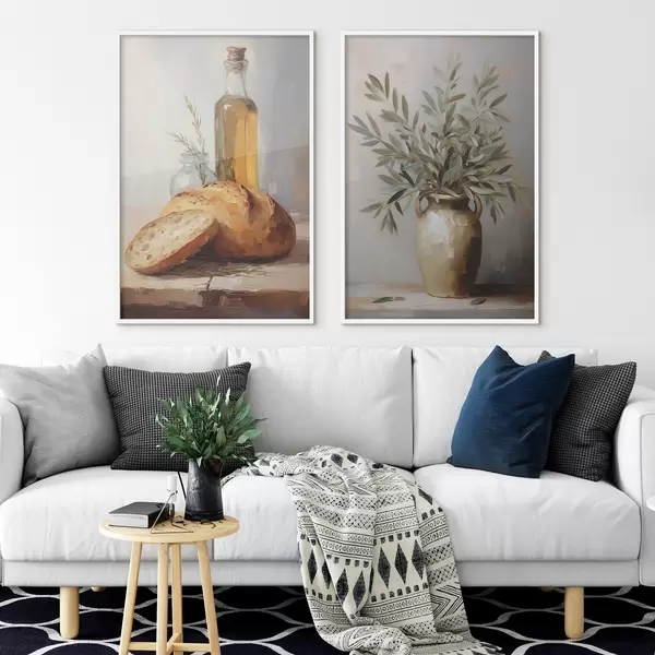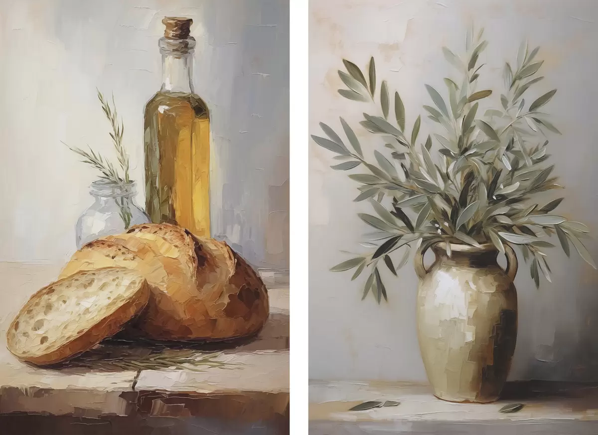 Poster Ramuri de măslin într-o vază, pâine și o sticlă de ulei, pictură imitație Nr d01035