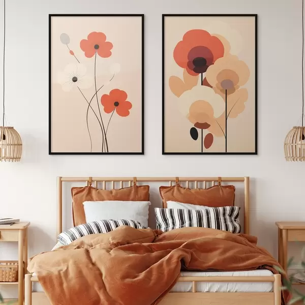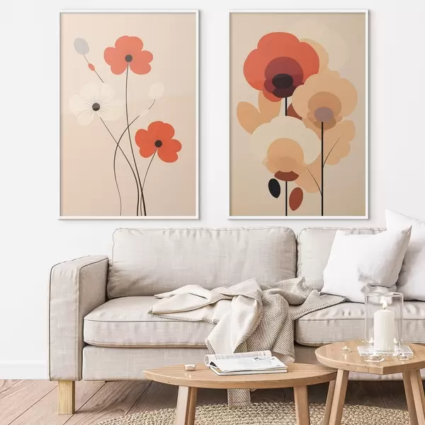 Poster Diptic floral minimalist în tonuri calde de bej-coral cu linii grafice d01090