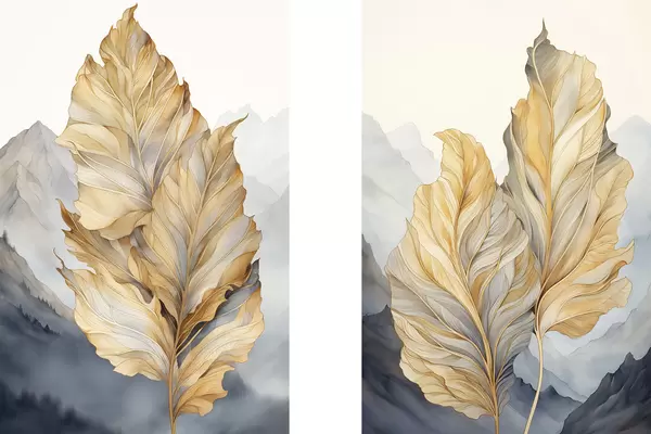 Poster Frunze abstracte mari, galbene și maronii, cu detalii complexe, pe fundalul unui peisaj montan Nr d01119