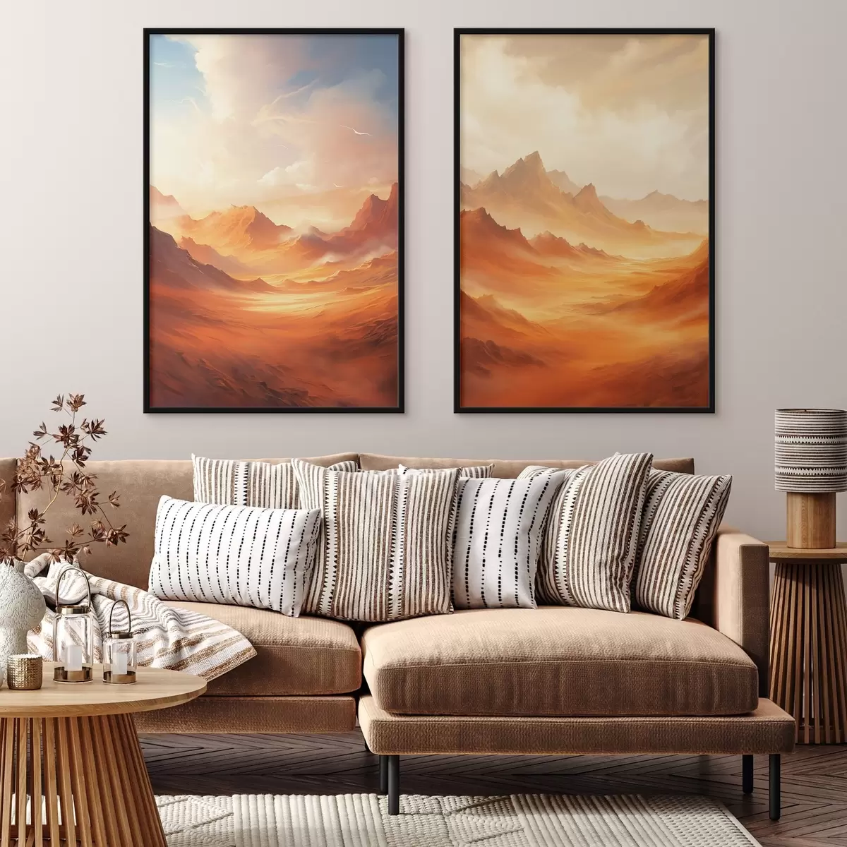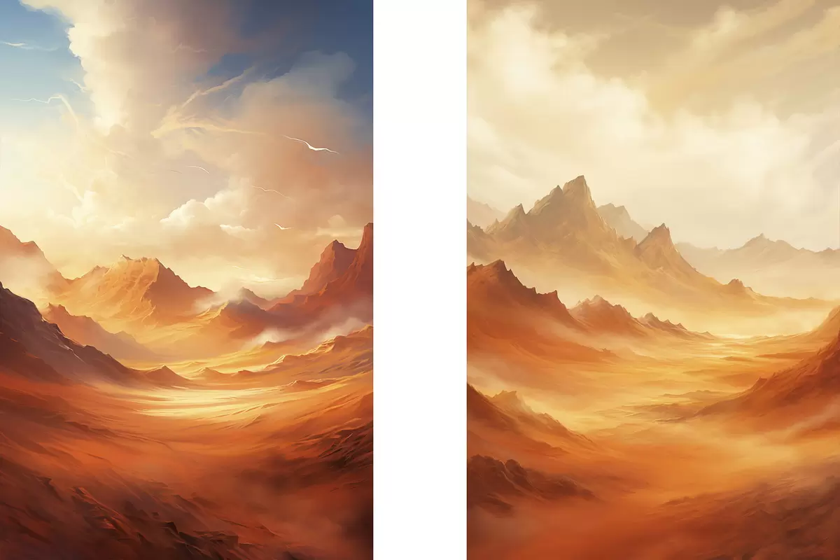 Poster Un peisaj vast, deșertic, de culoare portocalie, cu munți stâncoși falnici, sub un cer încețoșat, luminat de soare, cu nori subțiri. d01122
