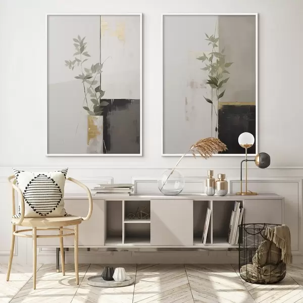 Poster O pictură minimalistă texturată reprezentând un vas cu frunze verzi pe un fundal de forme geometrice abstracte. Nr d01126