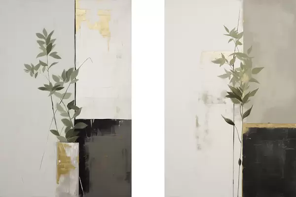 Poster O pictură minimalistă texturată reprezentând un vas cu frunze verzi pe un fundal de forme geometrice abstracte. Nr d01126