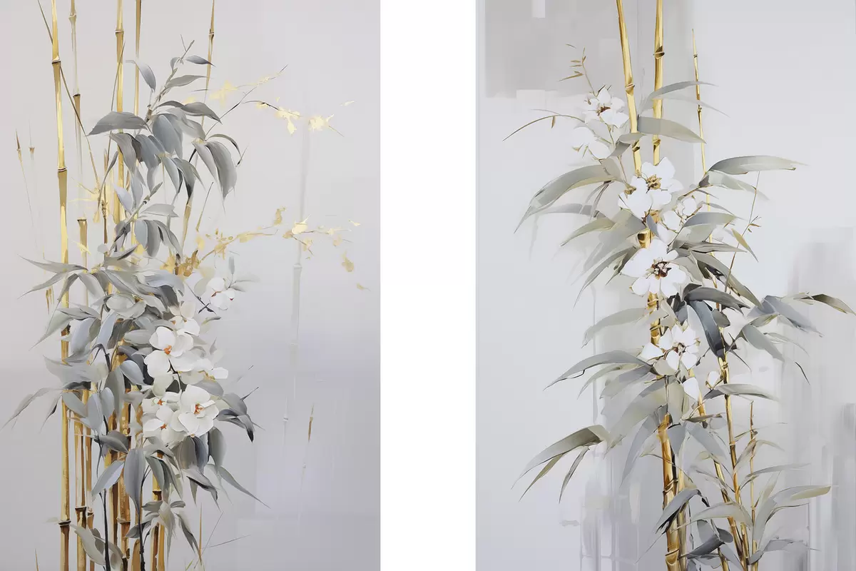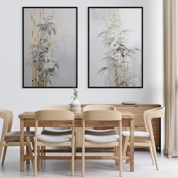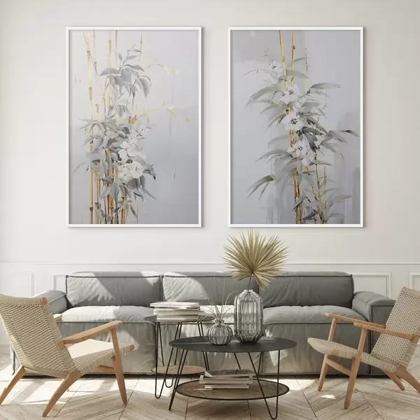 Poster Tulpini abstracte de bambus cu accente galbene, flori albe delicate și frunze verde pal, fundal gri Nr d01127