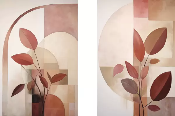 Poster Plantă abstractă cu frunze roșii pe un fundal de forme geometrice și culori delicate, discrete Nr d01128