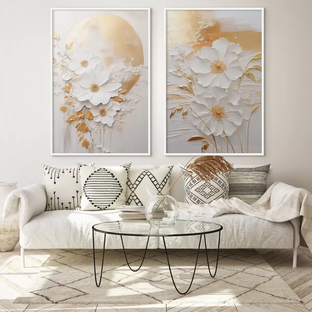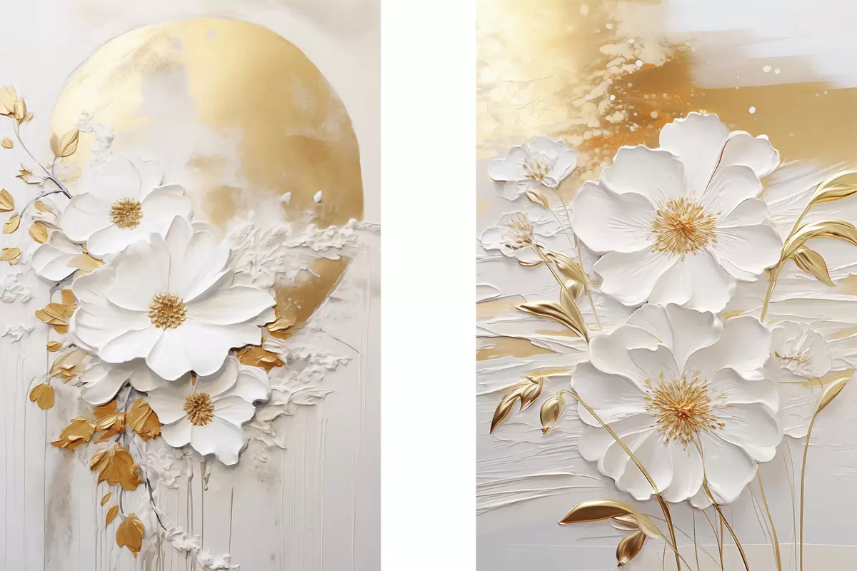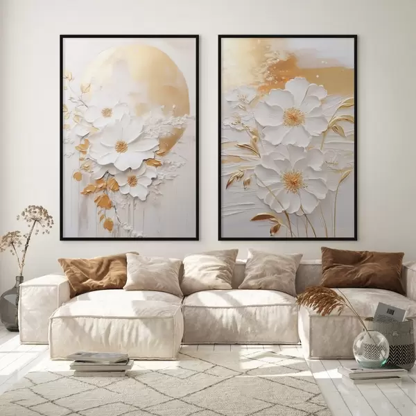 Poster Flori albe cu accente galbene și frunze delicate pe un fundal texturat, artă modernă Nr d01233