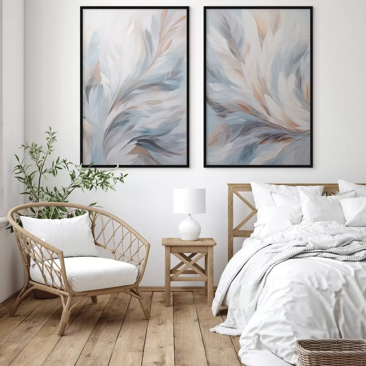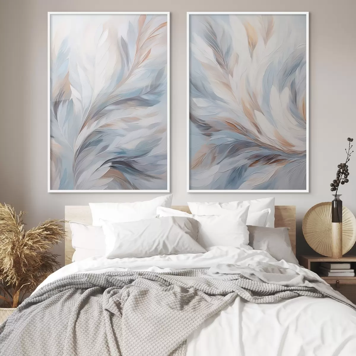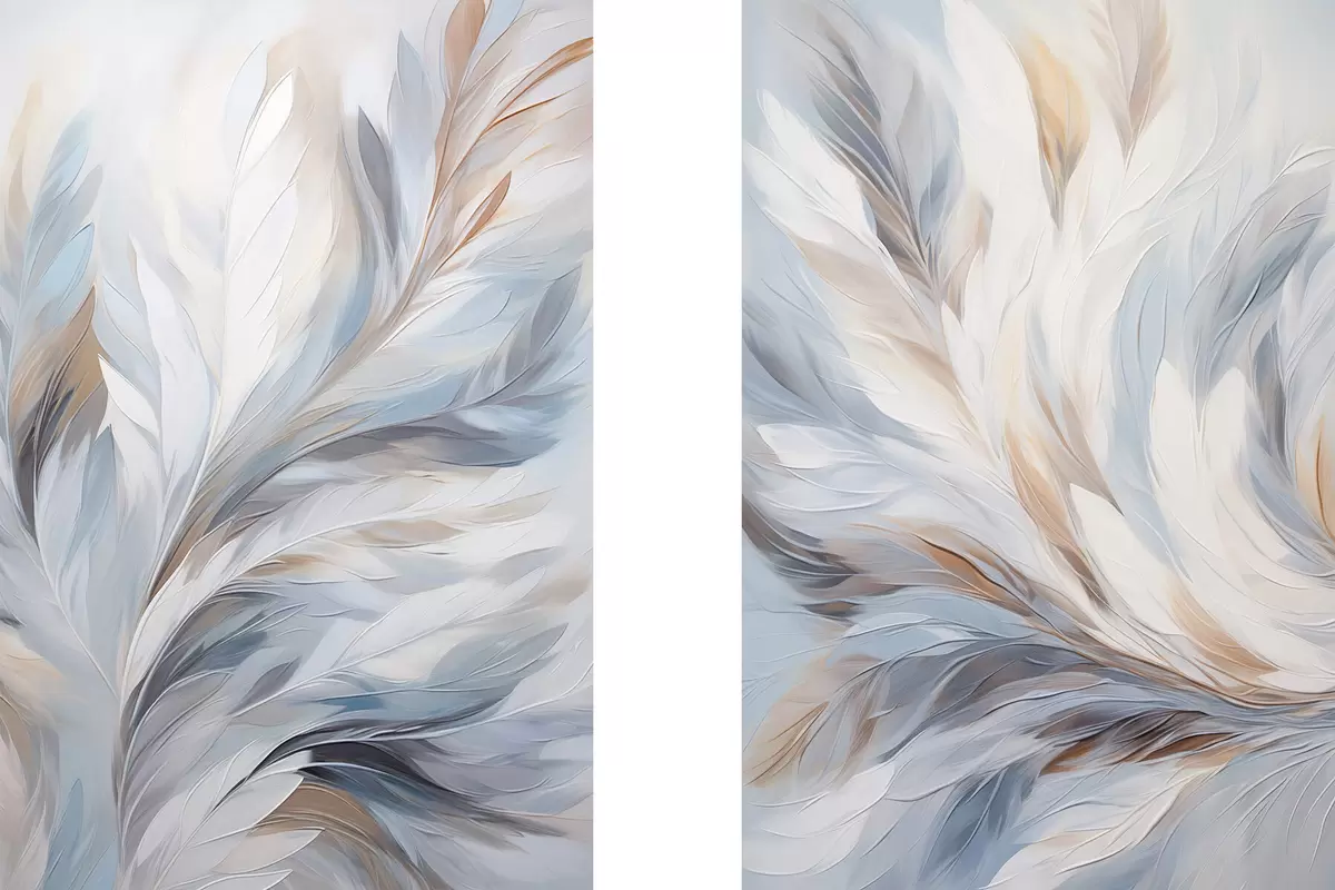 Poster Pictură abstractă cu pene în nuanțe de alb, albastru și maro, cu o textură moale, fluidă și un fundal deschis. Nr d01234