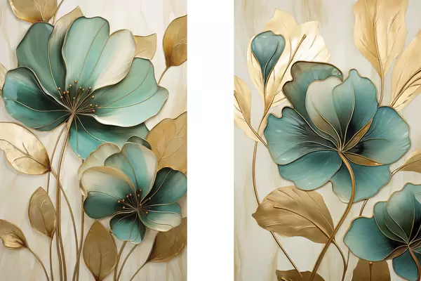 Poster Flori mari de culoare verde-albăstrui și galben, cu contururi, înconjurate de frunze galbene pe un fundal abstract Nr d01235