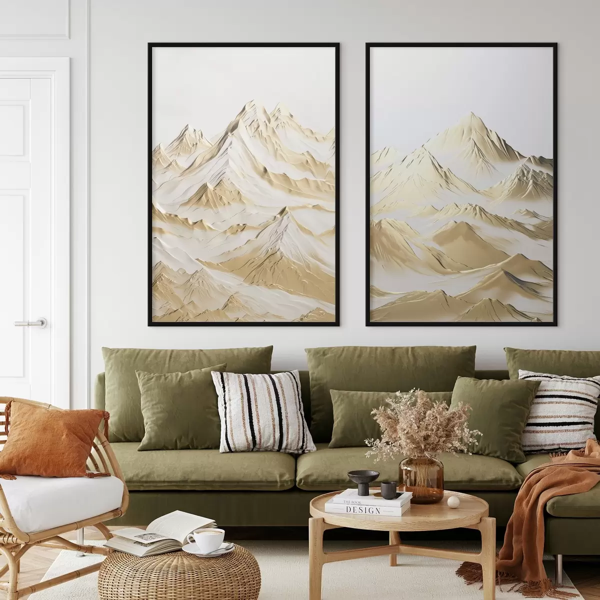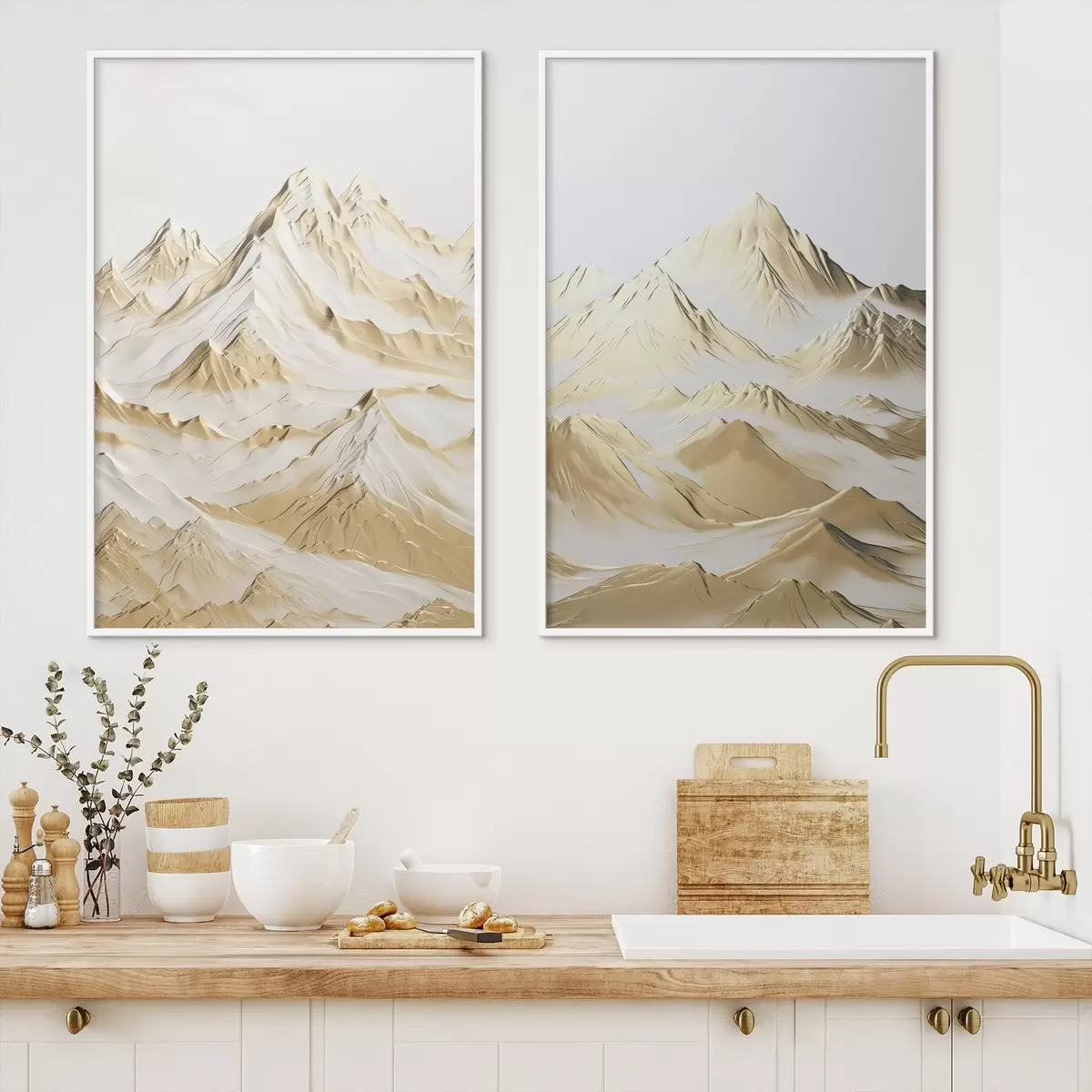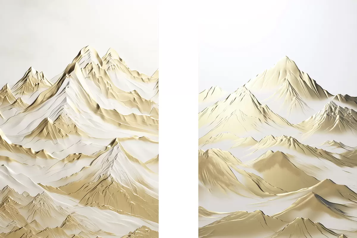 Poster Un peisaj cu munți galbeni, acoperiți de zăpadă, cu vârfuri ascuțite și văi adânci sub un cer luminos. Nr d01236