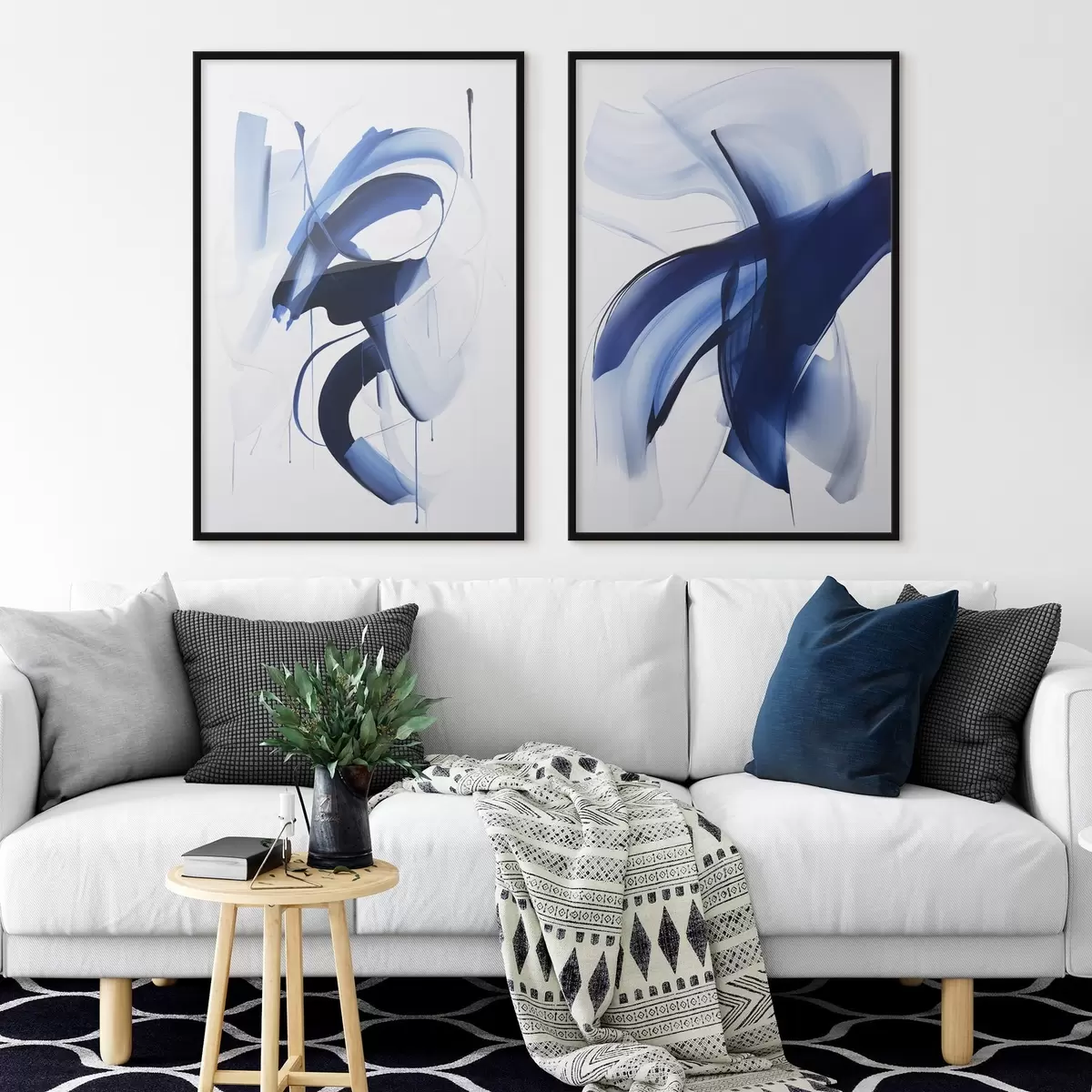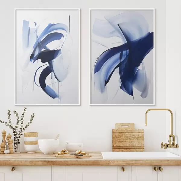Poster Forme abstracte albastre asemănătoare cu pensulele, cu linii și curbe fluide pe fond alb, artă modernă Nr d01240