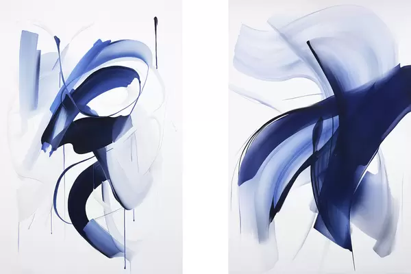 Poster Forme abstracte albastre asemănătoare cu pensulele, cu linii și curbe fluide pe fond alb, artă modernă d01240