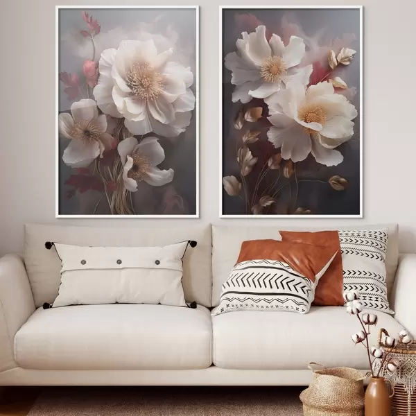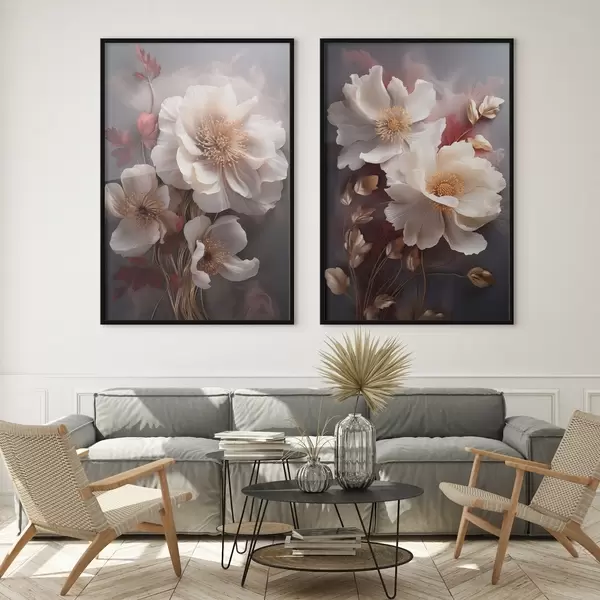 Poster Bujori delicați, cu petale subțiri și vaporoase, înconjurați de frunze roșii închise și galbene, pe un fundal abstract. d01243