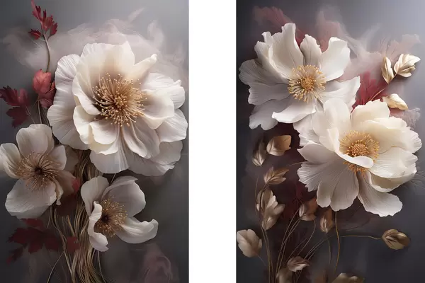 Poster Bujori delicați, cu petale subțiri și vaporoase, înconjurați de frunze roșii închise și galbene, pe un fundal abstract. d01243
