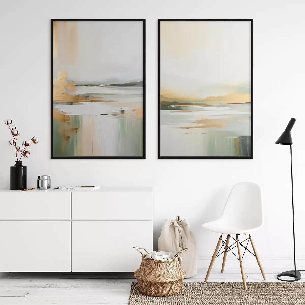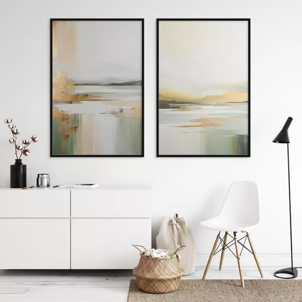 Poster Peisaj abstract în tonuri de galben și verde, apă care reflectă cerul și munții îndepărtați, cer palid și încețoșat Nr d01245