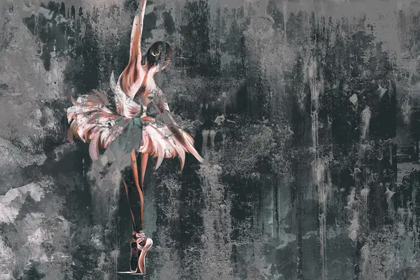 Poster Un perete crăpat care înfățișează silueta unei balerine cu elemente de acuarelă. f34608