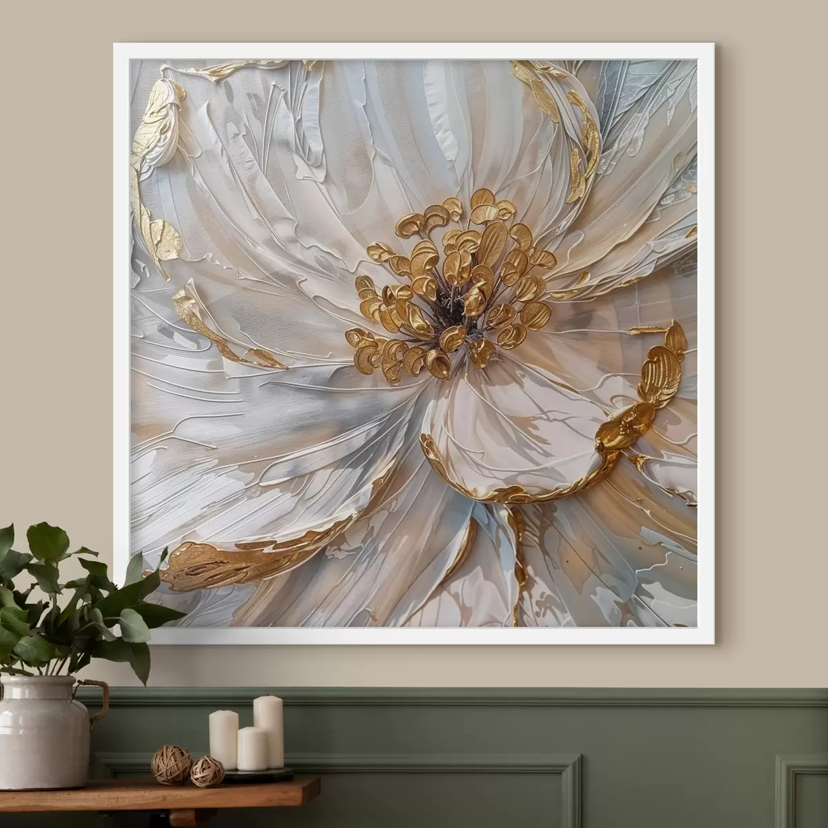 Poster Prim plan al unei flori mari albe cu stamine galbene în interior, decor artistic pictat în ulei Nr f38755