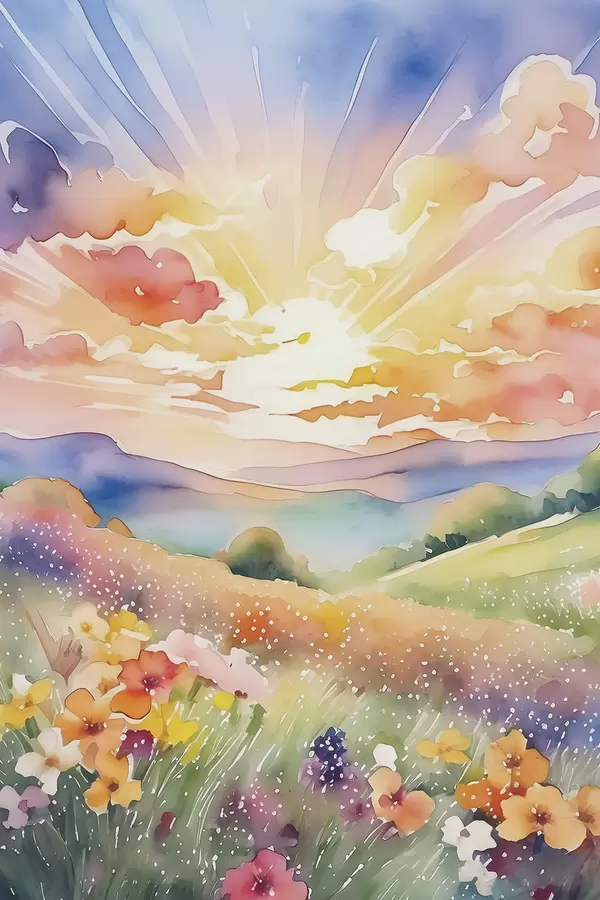 Poster Apus de soare în câmpul de vară, flori, soare, cer colorat, nori, natură f38842