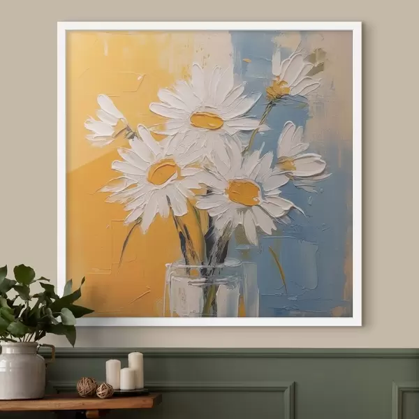 Poster Margarete albe într-o vază de sticlă pe un fundal albastru și galben, imitație de pictură în ulei, lovituri mari Nr f38907