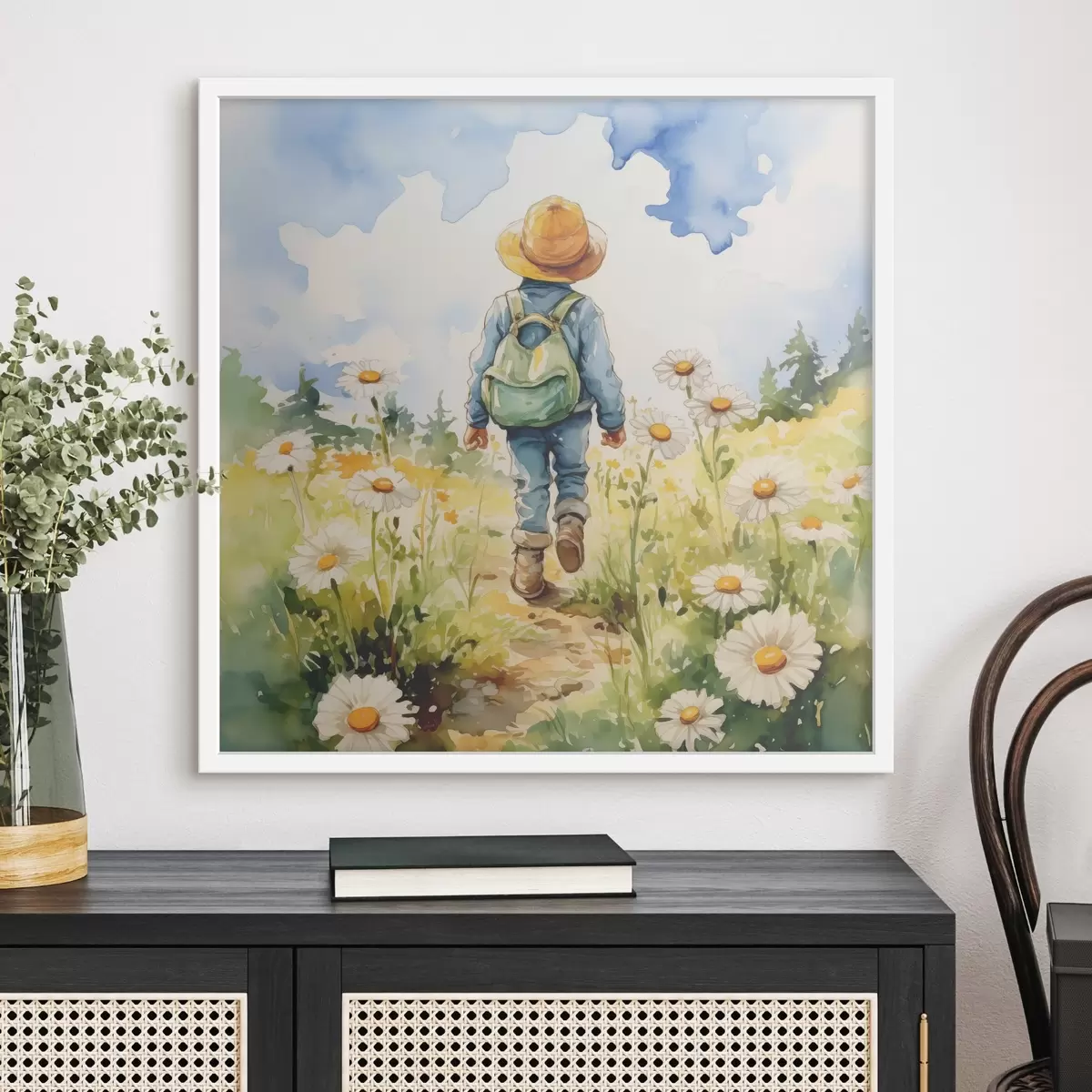 Poster Un băiat cu o pălărie de cowboy cu un rucsac verde în spate și un costum albastru merge de-a lungul unei căi într-un câmp de mușețel, acuarelă Nr f38946