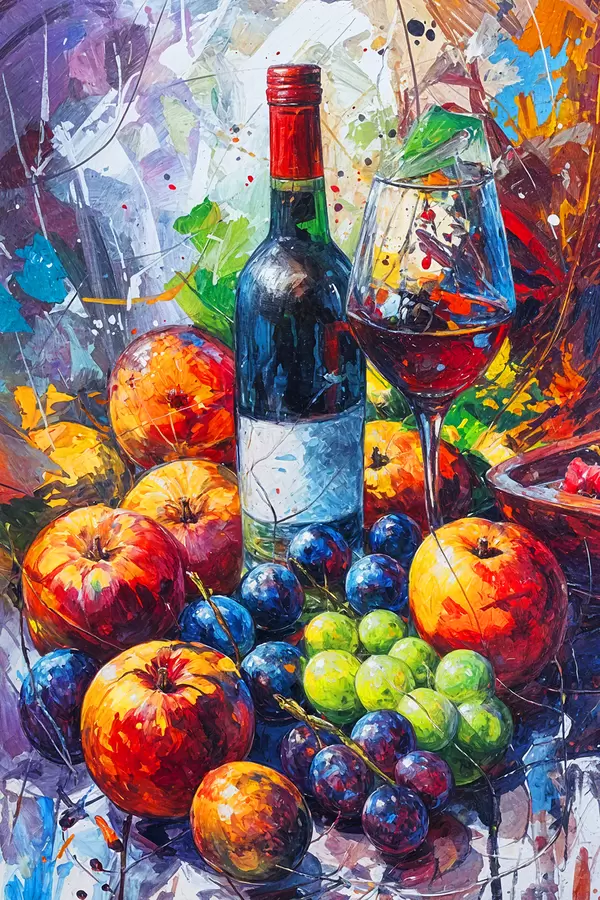 Poster Pictură abstractă de viață statică a unei sticle de vin, a unui pahar de vin și a fructelor colorate cu stropi de diferite culori Nr f38958