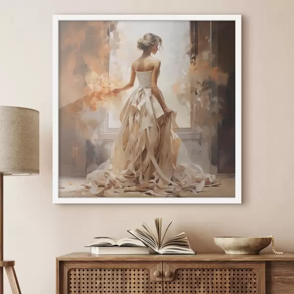 Poster O fată în rochie albă de mireasă stă la fereastră printre foc și pictează de mână Nr f39125