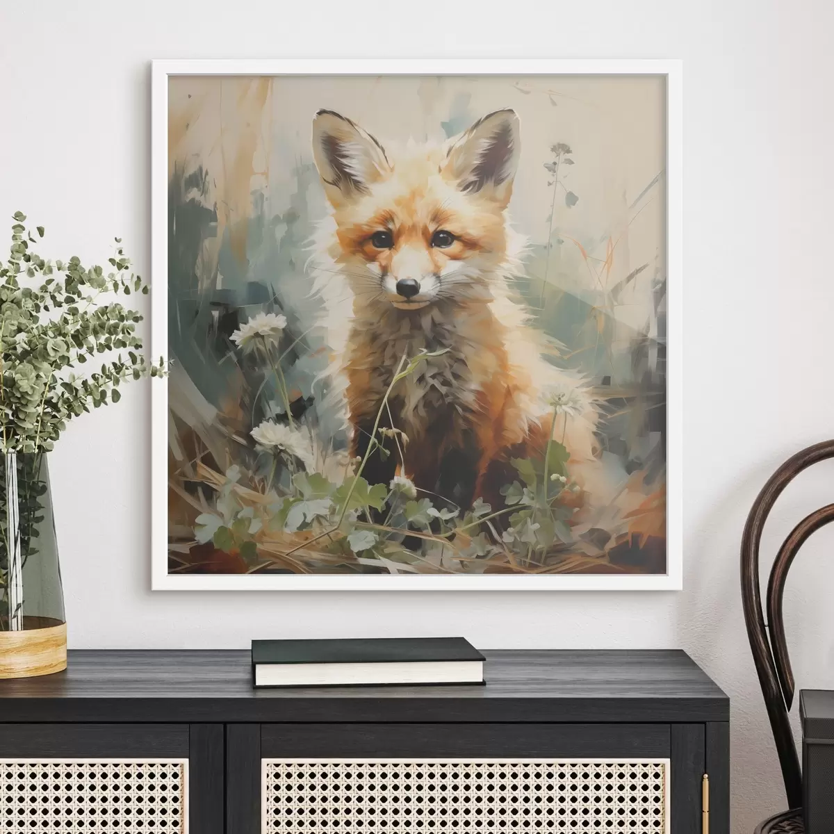 Poster Vulpea roșie stă în iarba uscată pe un fundal verde. Pictură în ulei Nr f39191