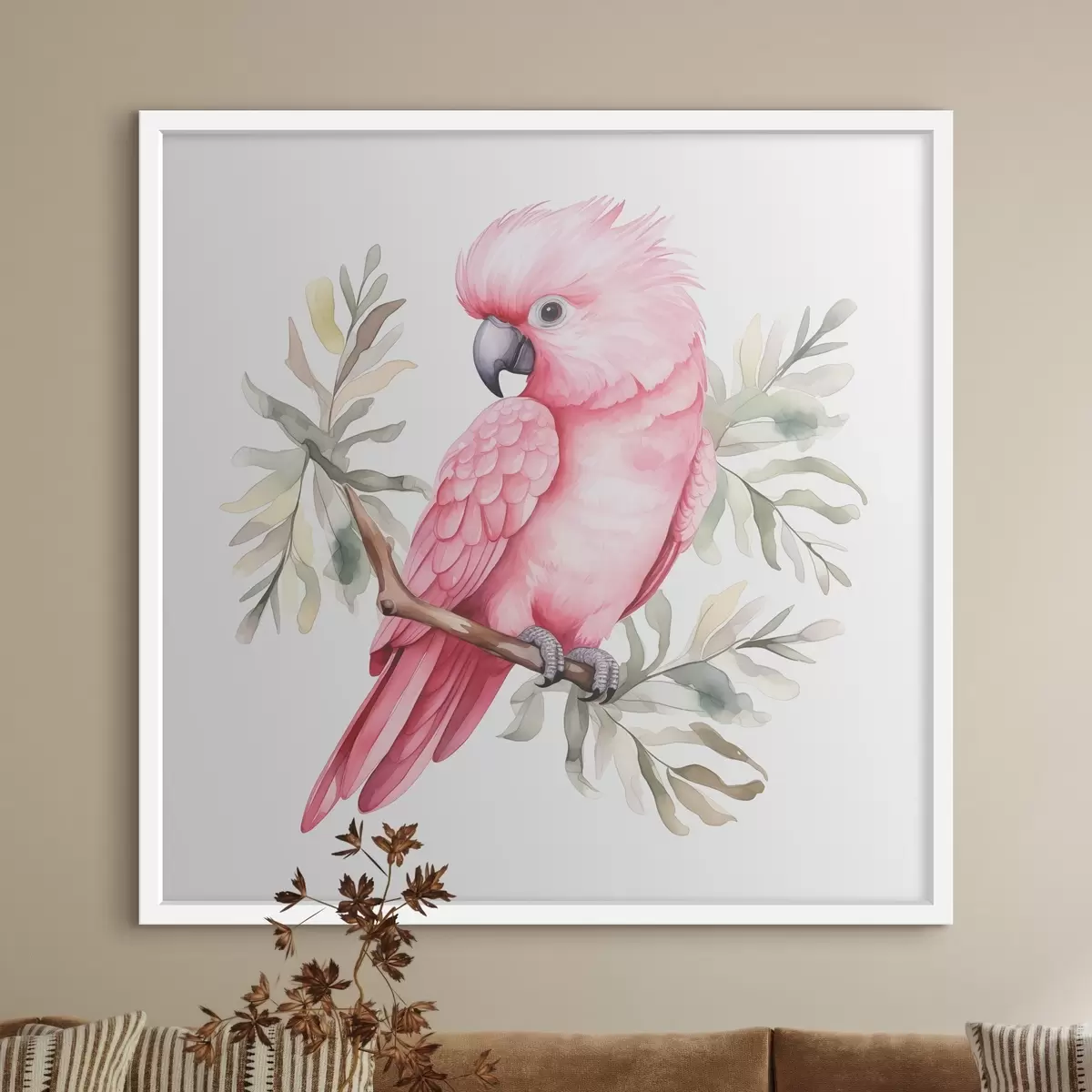 Poster Un papagal cockatoo roz stă pe o ramură de acuarelă Nr f39334