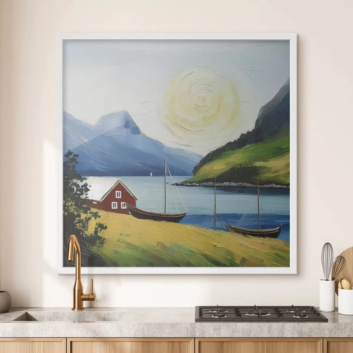 Poster Vara nordică, casă mică pe coasta mării, soare pe cerul albastru, munți f39423