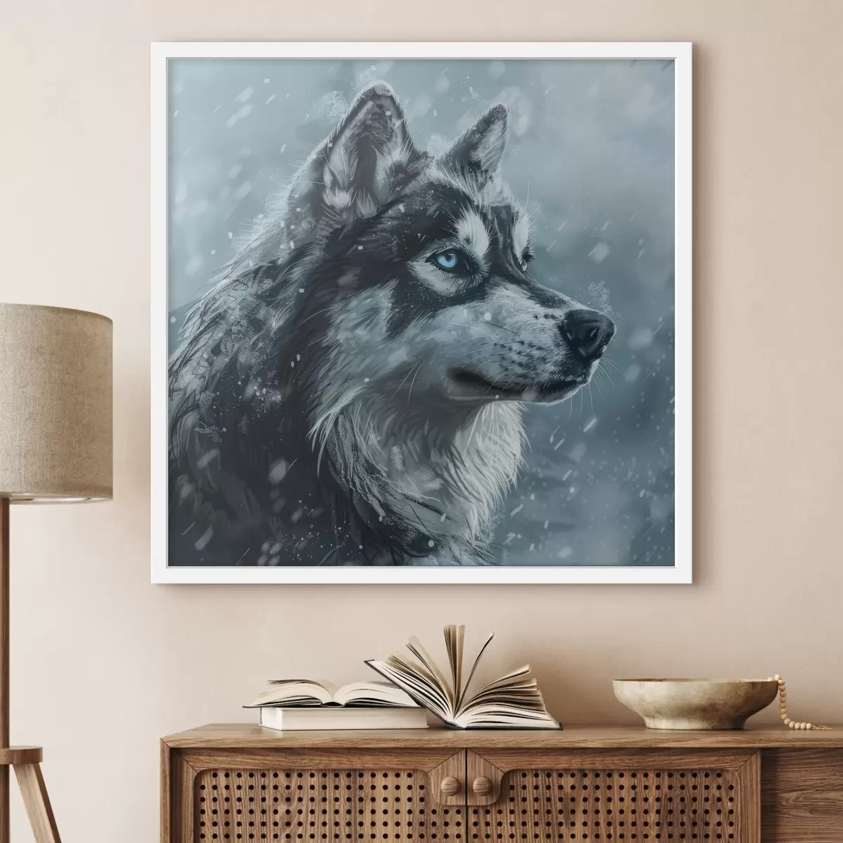 Poster Husky cu ochi albaștri pe un fundal albastru de iarnă Nr f39462