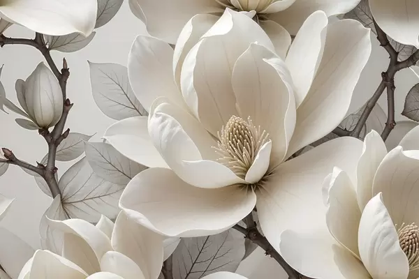 Poster Floare albă de magnolie cu petale delicate, înconjurată de frunze verzi pe fundal deschis Nr f39527