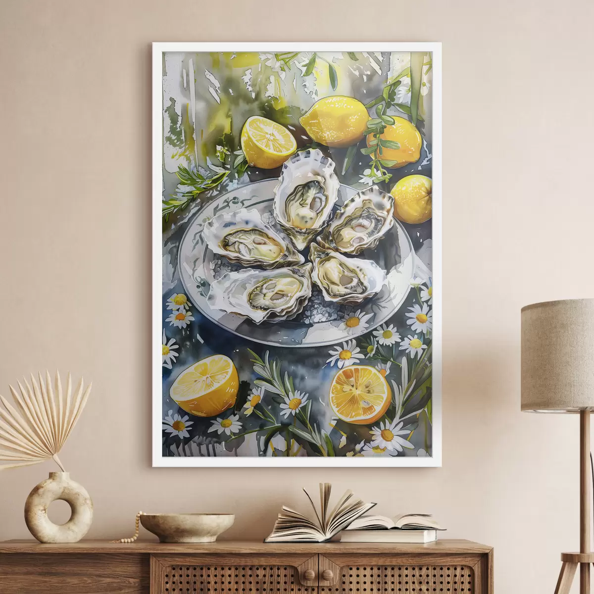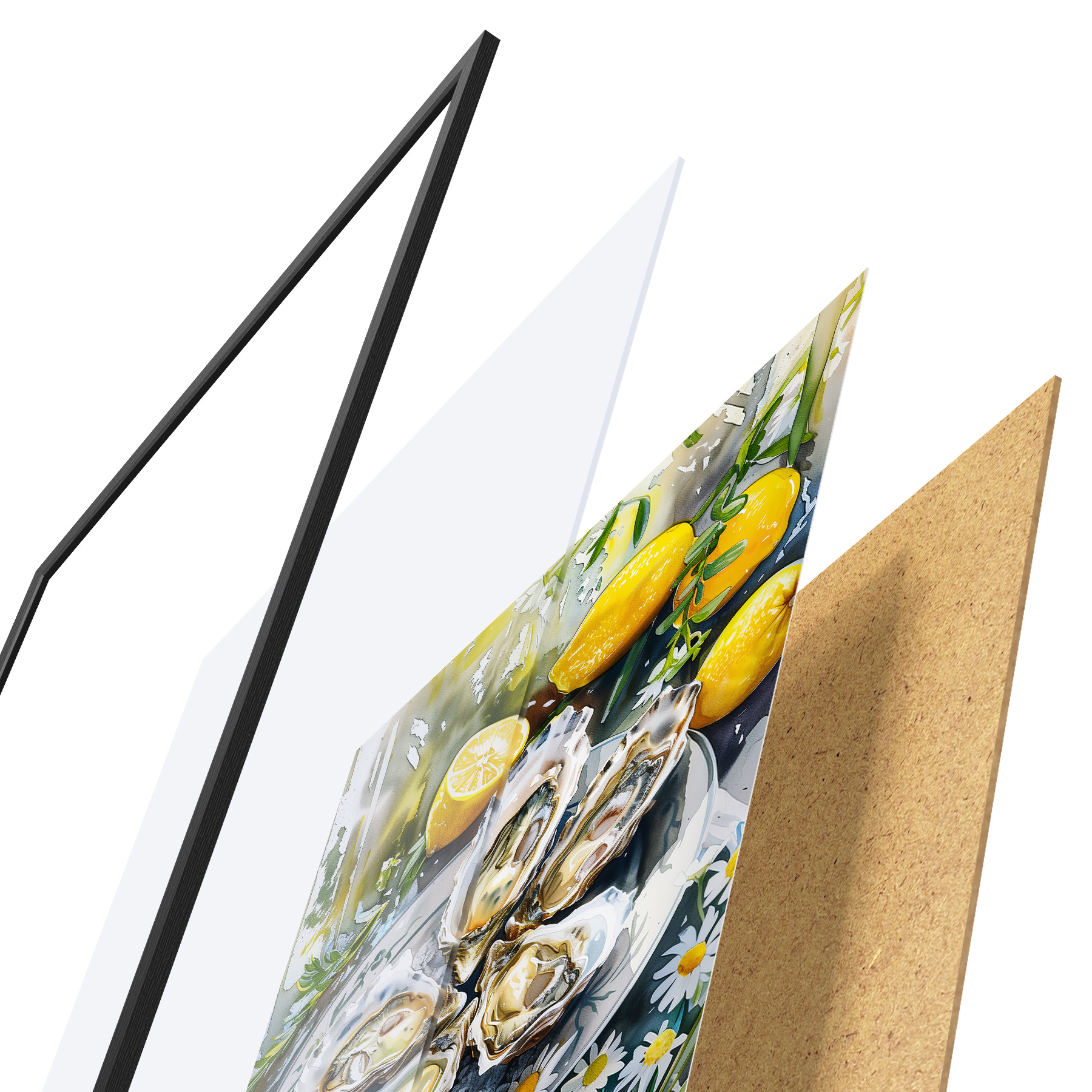 Poster Stridii elegante pe farfurie, lămâi și flori, culori de vară, mediteraneene f39710