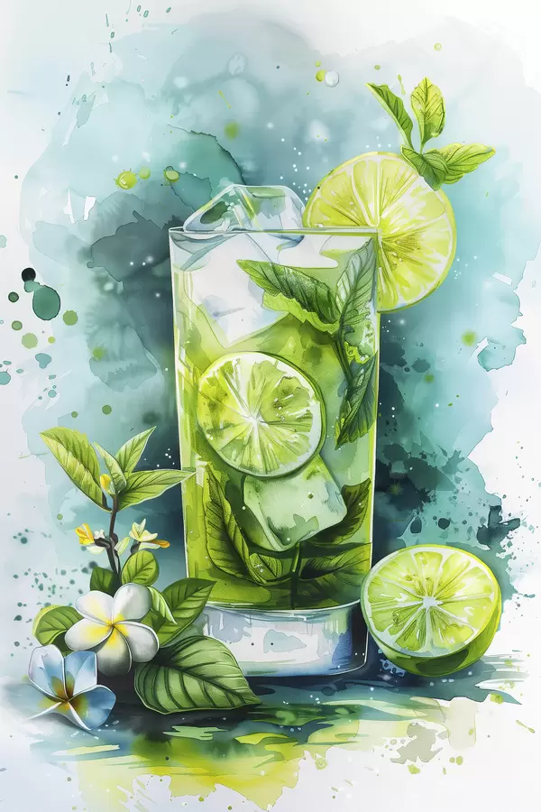 Poster Cocktail de vară acuarelă, mojito, lime și mentă, floral, culori verzi Nr f39712